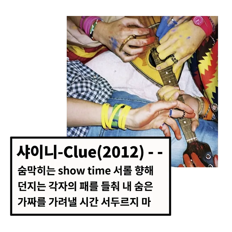 노래 제목이 생소하실 수도 있는데, 사실 들어보면 첫 소절부터 생각나는 노래가 다들 있으실 거예요. 엄청나게 메가 히트 친 노래인 '셜록'이요. 이 노래는 샤이니의 'Clue'와 'Note'를 섞어서 만든 곡이에요. 원래 이 두 곡 중 하나가 타이틀곡이 될 예정이었는데, 노래가 좀 심심하다 라는 이수만 선생님의 의견에 따라 "그럼 섞어보자!"의 결과물로 '셜록'이 나온 거예요. 이 비하인드 스토리를 들었을 때는 어떻게 이 두가지를 섞을 생각을 했을까 싶었는데요. '셜록'이 익숙한 분들이라면, 지금 소개해드린 'Clue'를 들으면서 '좀 빵 터지는 포인트가 적은데?'라는 인상을 받으실 수도 있어요.
