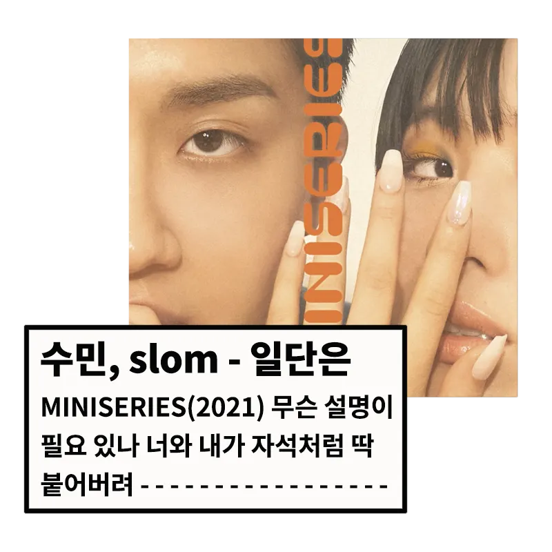 프로듀서인 slom을 만나기 전부터 수민은 싱어송라이터로서 활발한 활동을 하고 있었고, 자신의 음악을 스스로 '네오 케이팝'이라고 지칭하기도 하는 아티스트였어요. 아이유 '에필로그', 방탄소년단 지민 솔로곡 'lie'를 비롯해 수년간 케이팝 작업을 해왔고요. 그런데, 자신이 이미 다양한 음악을 잘 만들거나 부를 수 있는 사람인데도 신뢰할 만한 다른 프로듀서랑 작업을 해보고 싶다는 욕구가 있었다고 하더라고요. 그런 신뢰할 만한 사람이 slom이었던 거고요. 그래서 이 'MINISERIES'(2020)는 두 사람이 합작하여 만든 앨범입니다. slom-수민이 서로 신뢰할 만한 창작 동료이자 수수께끼 같은 관계라는 점 역시, 욘나-마리의 관계와 비슷하게 느껴졌어요.